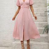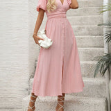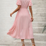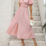 Conçue pour allier confort et style, cette robe midi met en valeur la silhouette avec sa taille cintrée et son tissu plissé léger. Les manches courtes bouffantes ajoutent une touche de volume charmante, tandis que l'encolure en V et la boutonnière frontale apportent un style féminin et moderne. Portez-la avec des sandales à lacets pour un look bohème chic irrésistible.